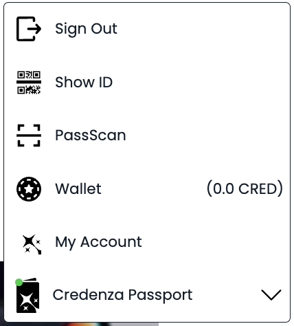 Once the user is logged in, the navigation bar will still be rendered, but the dot will now be green. Clicking on the band will now open a menu with a series of options, including the ability to purchase tokens, generating cryptographically-signed identifying code called Passport ID, scan a proprietary QR Code caleld PassScan, and manage their account, as well as the ability to sign out: